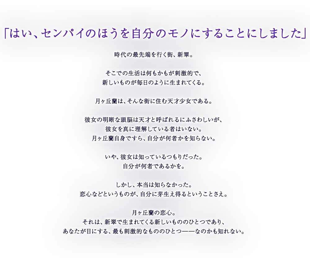 不过也借此机会,他与小时的青梅竹马再会,也认识了新的朋友们,还邂逅了伊织,平静的生活渐起波澜――